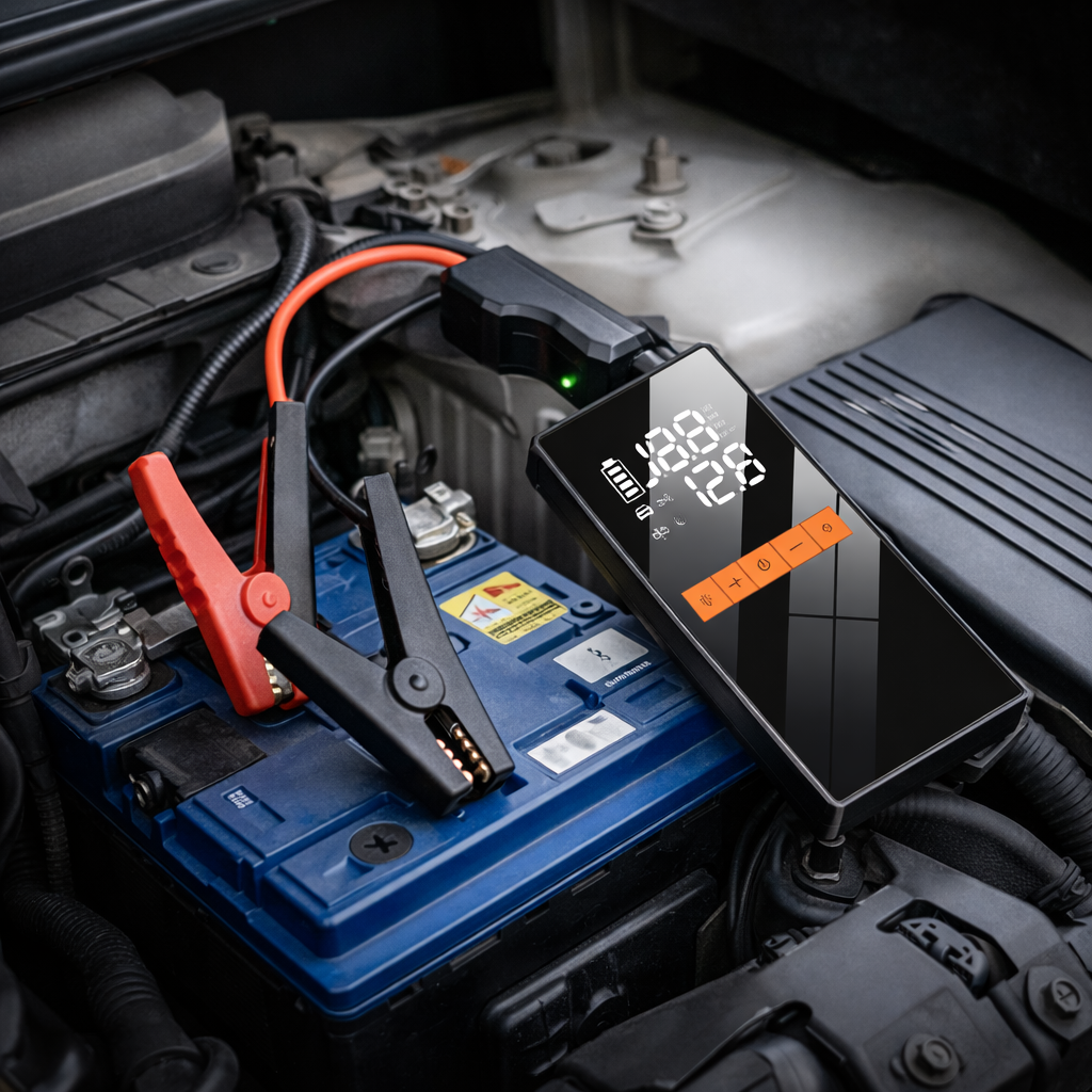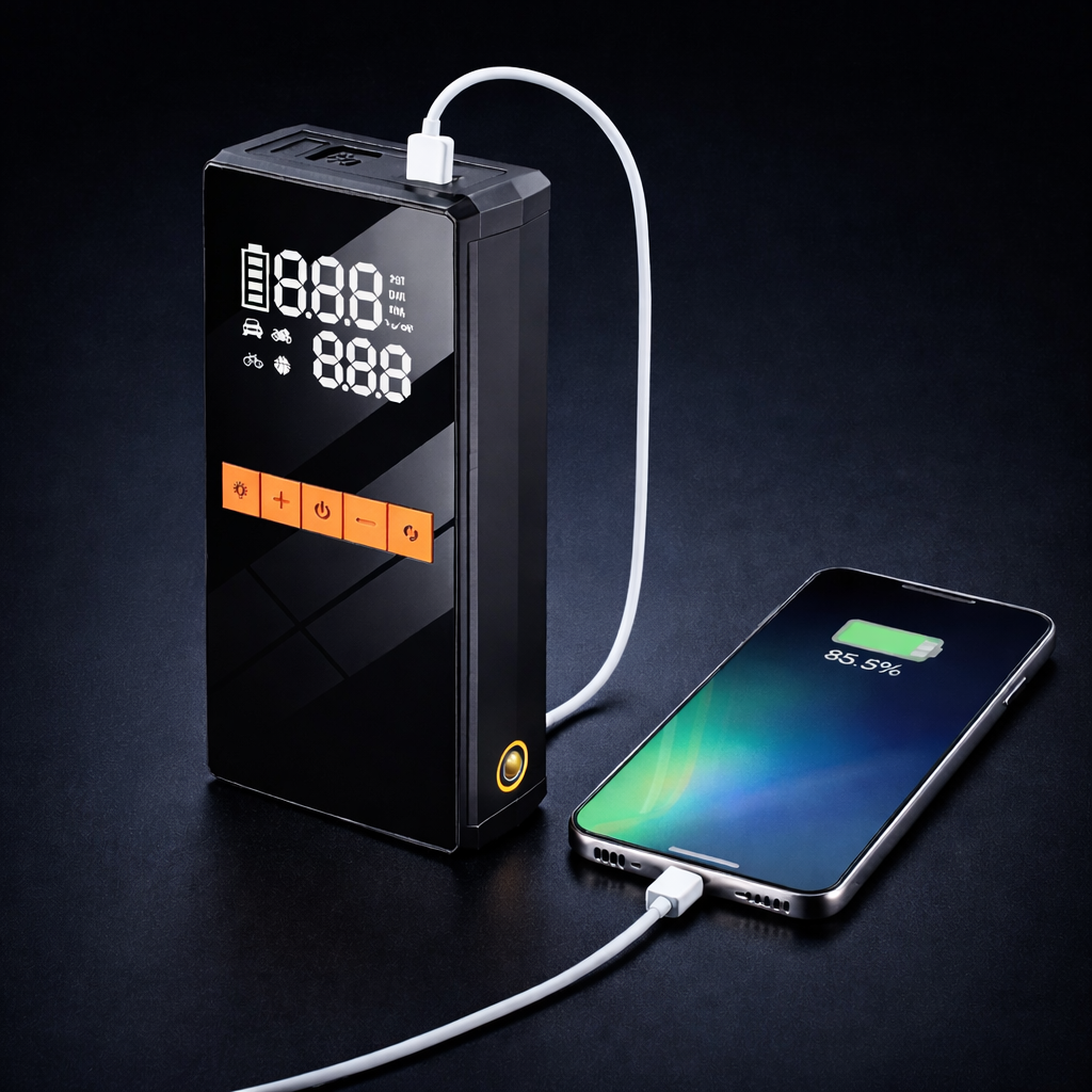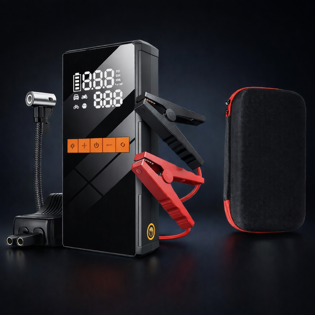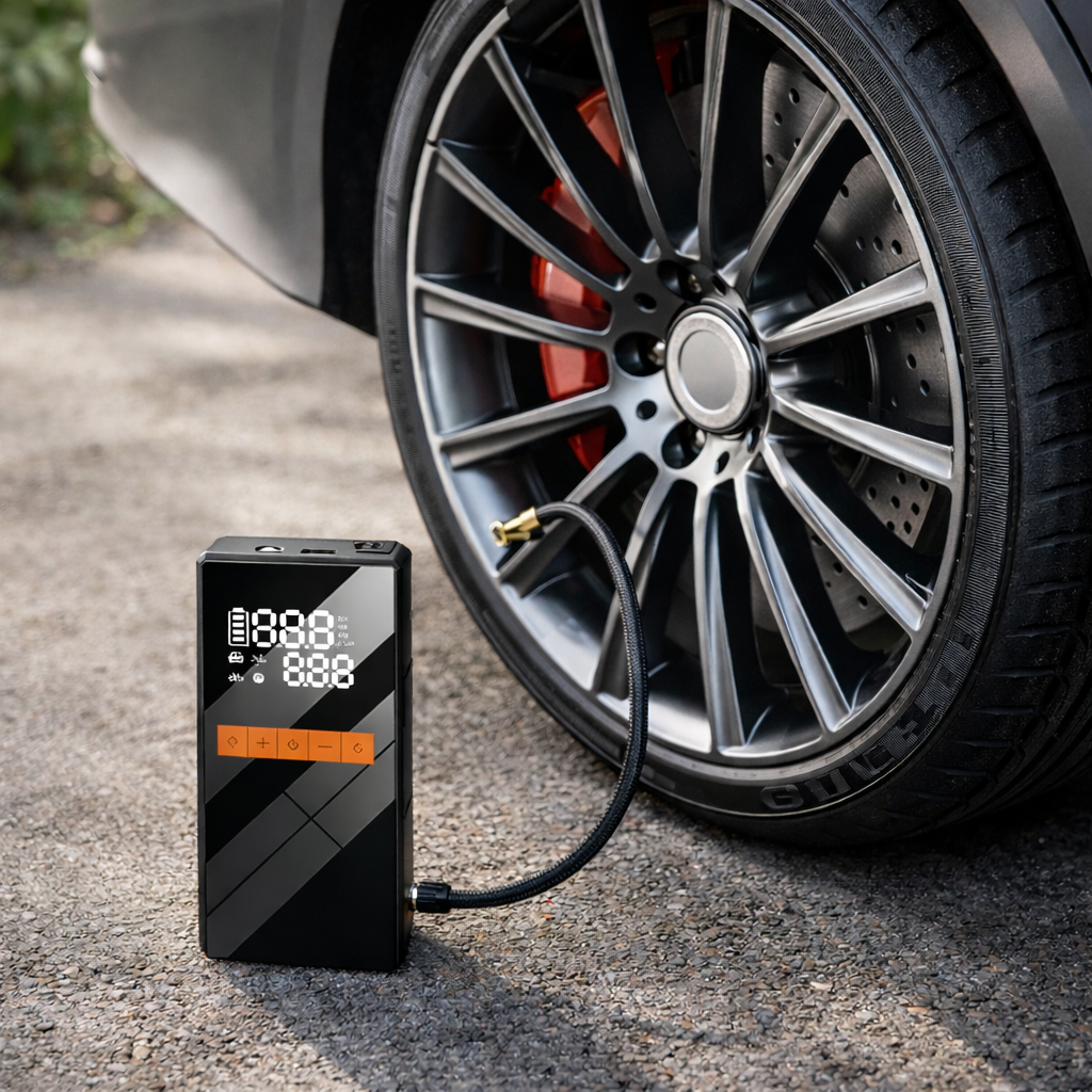 To podróż bez stresu — awaryjny starter samochodu, wbudowany kompresor, powerbank łądujący i latarka w jednym urządzeniu.